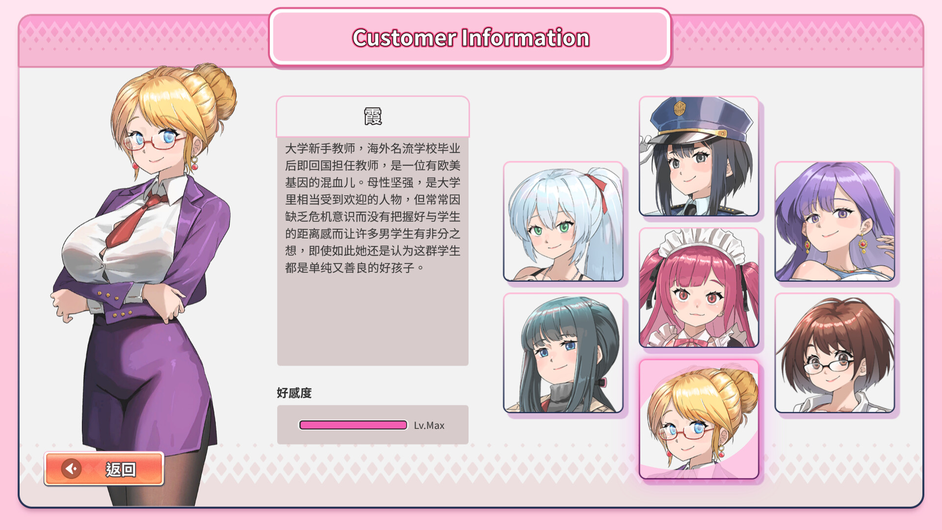 大学新手教师,海外名流学校毕业后即回国担任教师,是一位有欧美基因的混血儿。母性坚强,是大学里相当受到欢迎的人物,但常常因缺乏危机意识而没有把握好与学生的距离感而让许多男学生有非分之想,即使如此她还是认为这群学生都是单纯又善良的好孩子。