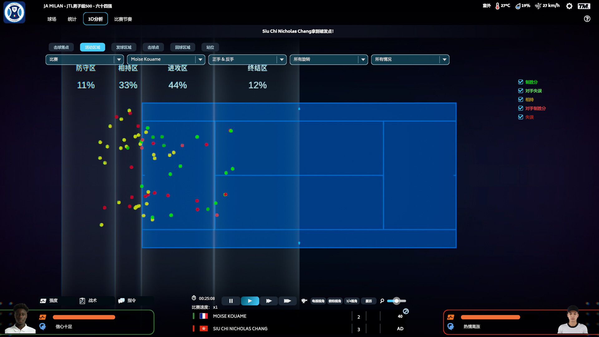 系列第五代作品引入全新战术蓝图!基于对现代网球技术与赛事数据的精密分析,带来更具深度的战术管理体系。历经多年职业巡回赛策略研究,我们重塑战术模型以实现更真实的赛场体验。现在你可以结合球员优势、对手弱点及每场比赛的具体条件(场地类型、心理状态、体能分配与关键分处理)设计细致入微的比赛方案!