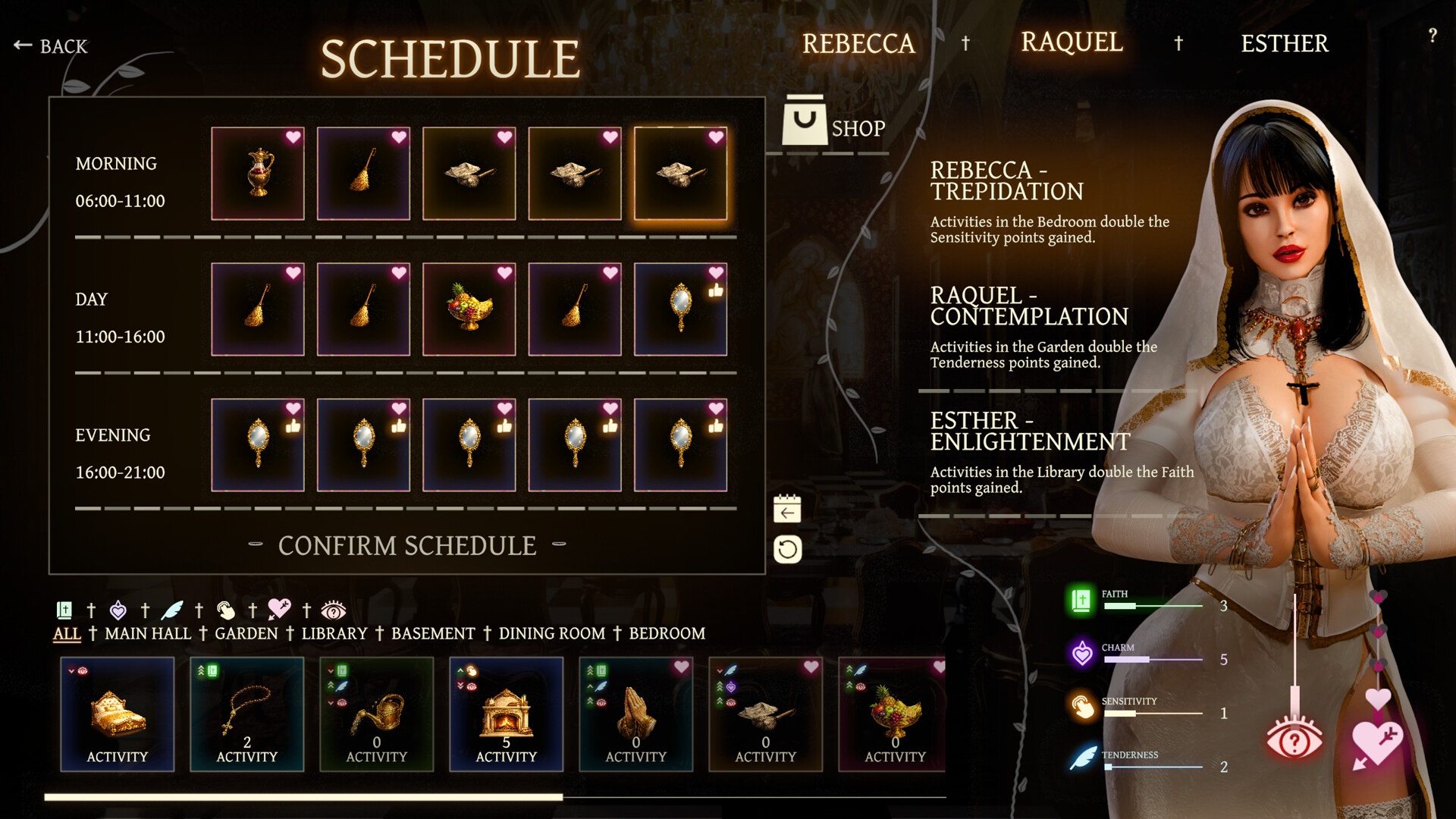 每位修女都有自己的性格、秘密与禁忌幻想。通过时间管理与选择,你将引导她们走向被禁止的自我探索。