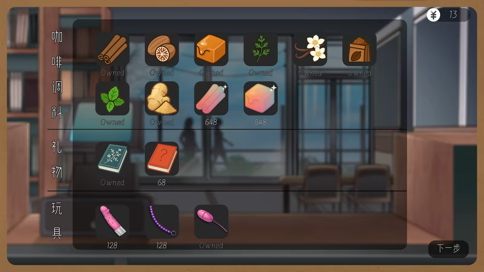 通过重复游玩获取金钱,解锁互动玩具、丰富咖啡配料种类,也可以送给冬乃小礼物哦。